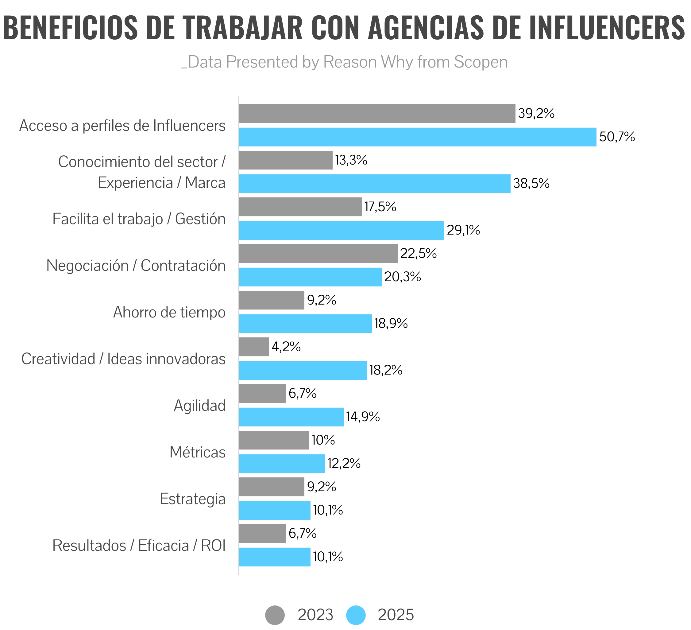 エージェンシー側でも、女性のプロフィールが圧倒的に多く (72%)、その大多数はマドリード (81%) であり、平均年齢は 10 歳です。 34年 アカウント管理、インフルエンサー マーケティング マネージャー、CEO までのさまざまな役職があります。