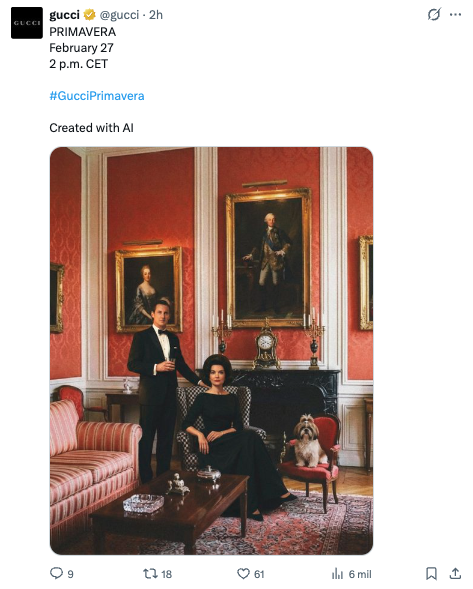 一部のユーザーは、画像の公開はある種のコミュニケーション実験に相当する可能性があり、ブランドがユーザーの反応を分析しているのではないかと指摘している。ただし、グッチが人工知能の使用を検討したのはこれが初めてではありません。2023年にグッチはAIで生成されたNFTのコレクションを作成し、ソーシャルネットワーク上でその技術を適用した作品を公開しました。
