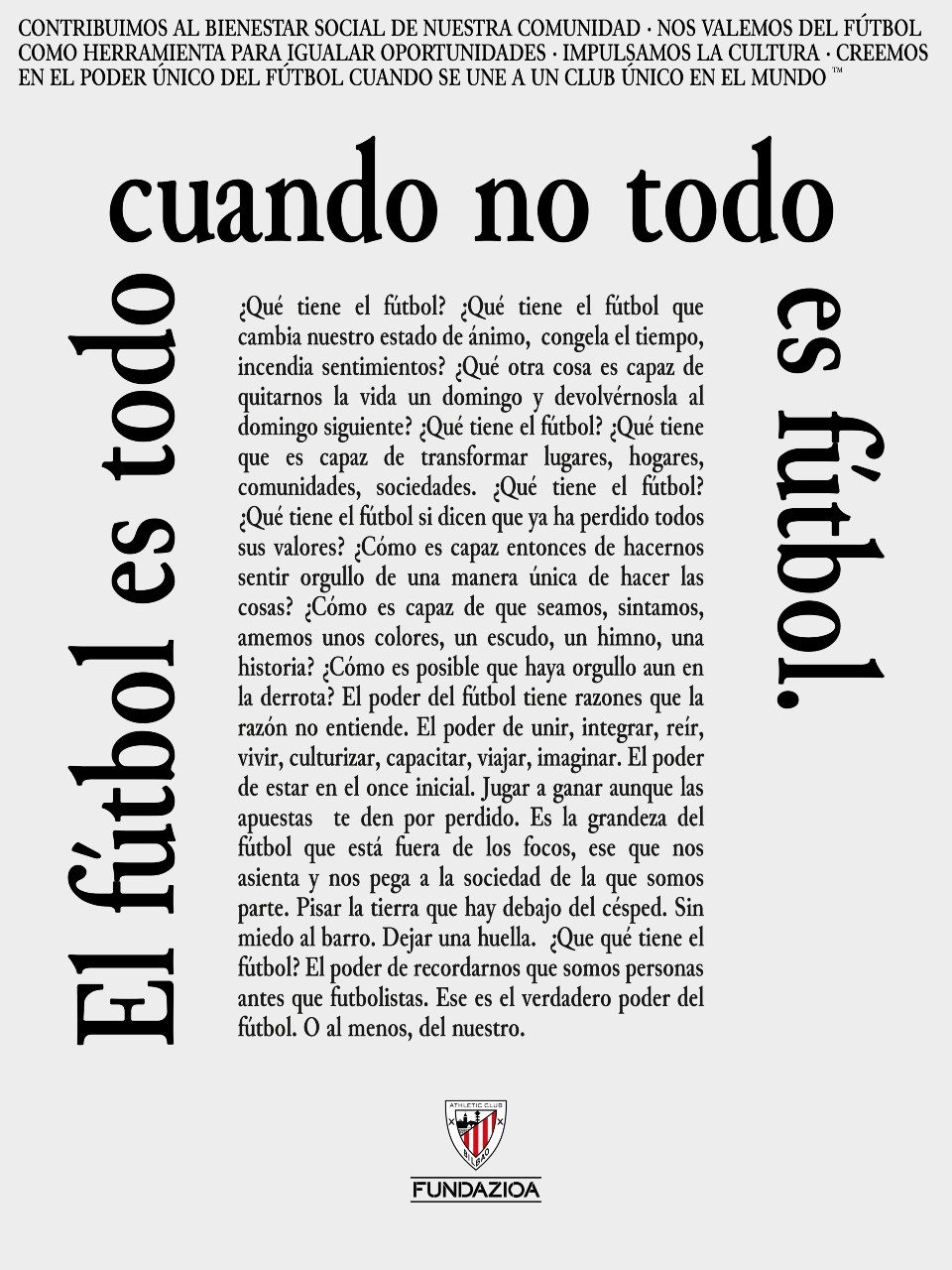 アスレティック クラブ フンダジオア は、社会変革のツールとしてのスポーツの役割を強化する提案である、「すべてがサッカーではないとき、サッカーはすべてである」というコンセプトの下で新しいコミュニケーションプラットフォームを発表しました。クリエイティブエージェンシー MUY と共同で開発されたこの取り組みは、コミュニティ、インクルージョン、文化という 3 つの軸を中心に構成され、財団の新たな戦略的段階を示します。