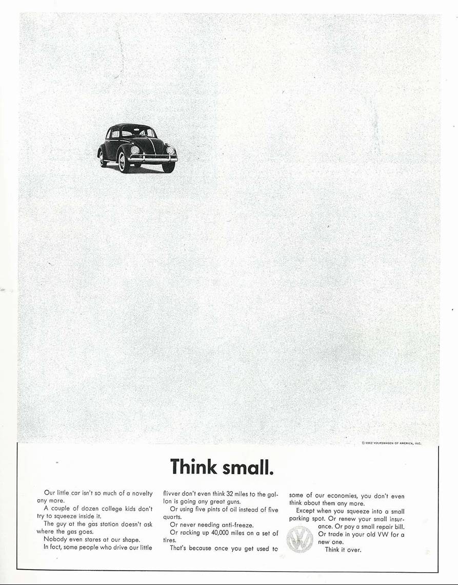 グラフィックが呼び起こす の戦略と美学 「小さく考えてください」 (「Think small」) は、ビートル モデルを宣伝するために 1960 年代に広告マンのビル バーンバックと DDB 代理店によって考案され、史上最も影響力のある広告キャンペーンの 1 つと考えられています。