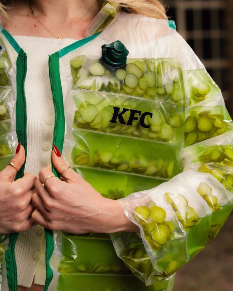 と呼ばれる衣服 「ピクルスフグ」 ダウンジャケットからインスピレーションを受けているため、 ピクルスのスライスとジュース 透明な生地のおかげで、それが見えます。さらに、この成分は、ピクルスの形をしたジッパーやどこでもジュースを飲める一体化されたストローなど、他のデザインの細部にもインスピレーションを与えています。 KFCのロゴがデザインを完成させます。