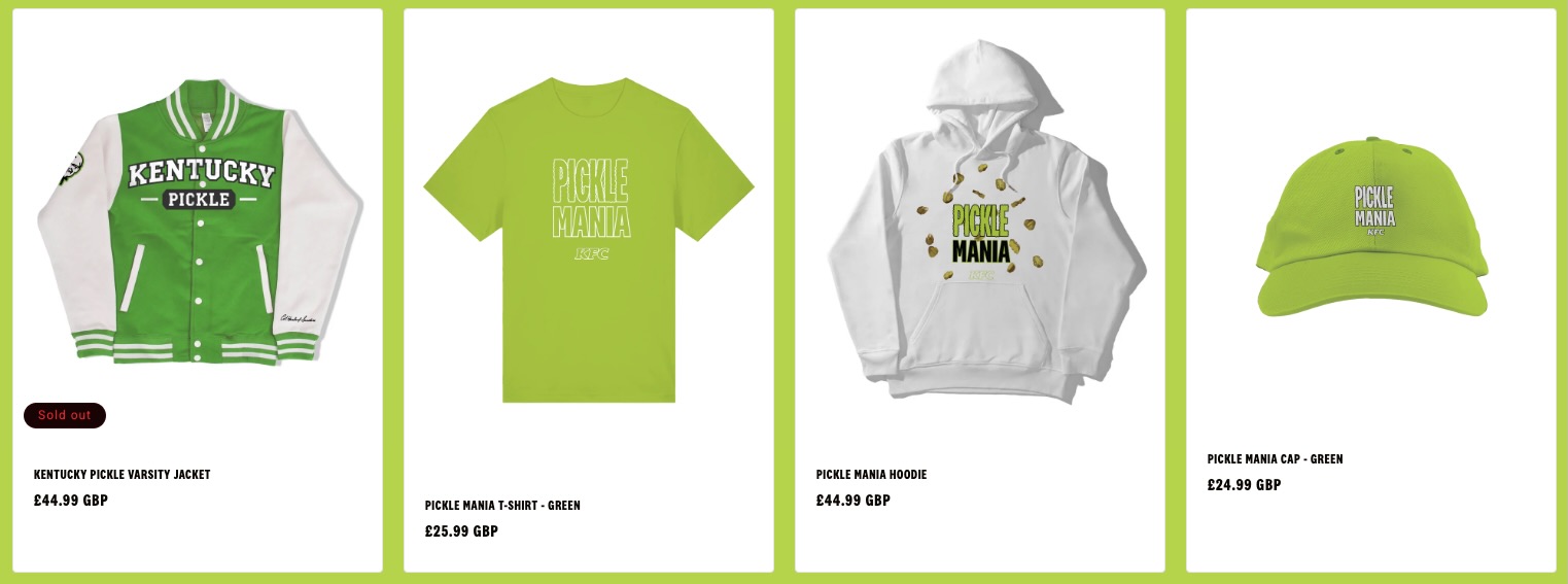 ただし、このブランドはまた、 衣類コレクション ピクルスからインスピレーションを得たもの。オンラインストアで見ることができるように、黒と白に通常のピクルスグリーンを組み合わせたキャップ、スウェットシャツ、Tシャツで構成されています。