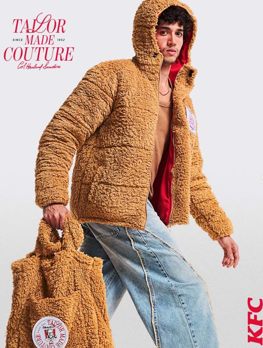 によると 小さな黒い本シェルパ生地は衣服をカスタマイズするために使用されており、KFC のチキンバッターの外観と色調を模倣しており、ブランドの特徴的な歯ごたえをファッションに変換しています。複雑かつ繊細な職人技を駆使して手作業で縫製されるため、一から衣服を作るよりも手間と時間がかかります。