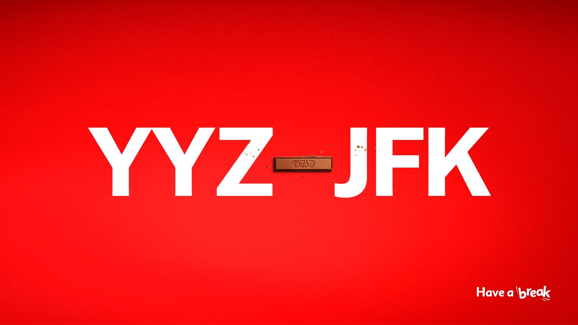こうして彼は一連の作品を制作しました。 シンボルはチョコレートバーのバーに置き換えられます。ミニマルなスタイルのグラフィックは、主にビジネスや仕事の領域に関連した 2 つのコンセプトを関連付けており、ブランドカラーの赤い背景に白い文字で表現されています。たとえば、9 時から 5 時までは、勤務日と休憩中にキットカットを楽しむ可能性を指します。トロントとニューヨークの空港を結ぶ YYZ-JFK 便は、旅行にチョコレートを組み込む機会を提供します。